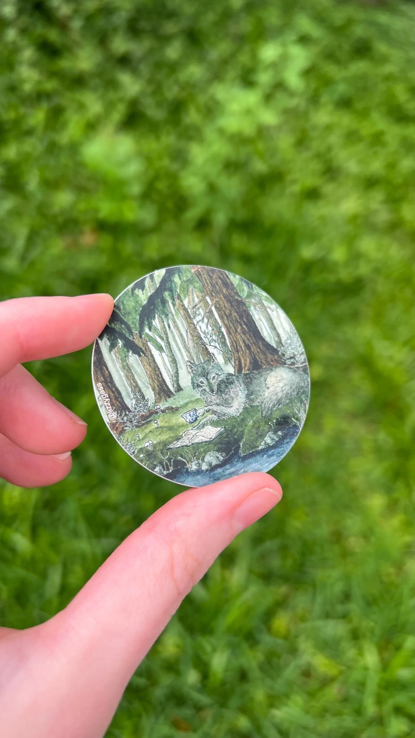 Matte vinyl sticker featuring my original watercolor and ink illustration of a wolf enjoying a cup of tea and a good book on the banks of a babbling brook.
